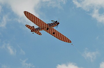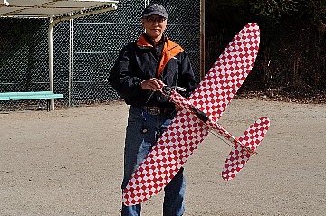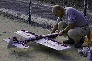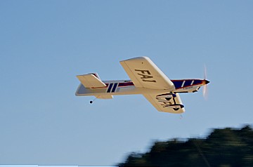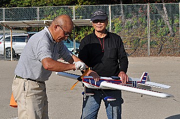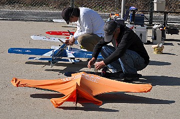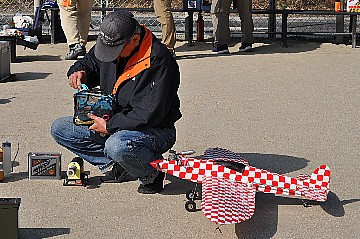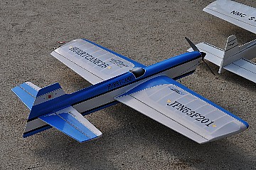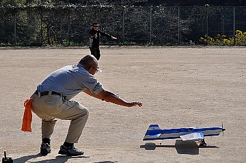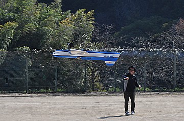 | 2 チカットファイヤー 少し久振りの成田さん。 レーサー風のスピットファイヤーですが、全面チェック柄のフィルム。 目がチカチカ、カメラのオートフォーカスのピントが合いません・・・ってのは冗談です(笑)。 KMCoのスピットファイヤーベースでFS52 4サイクル搭載です。 |