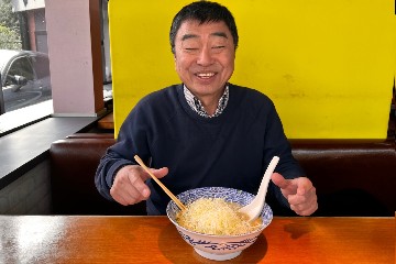 | 5 おまけ メーヴェ 重心位置が翼の55%、 ファンを回して振り回してみると、クルクル回ってしまいます。 重心を前にする手だてを考えないと飛ばないですね。 バイシャンタン 飛行会後、山田さんと久々にバイシャンタンの「卵キャベツ麺」を食べてきました。 数枚撮った写真から一番の変顔を(笑)。 |