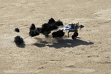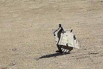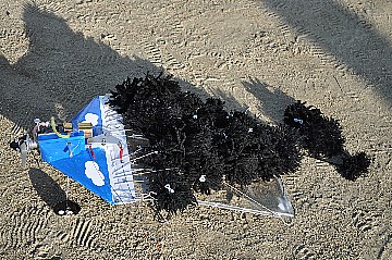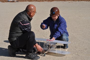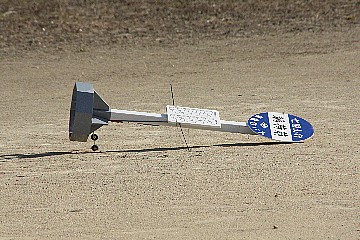 | 3 競技開始 厳正抽選で1番手の長坂さんがねこばすを飛ばします。 倒立でエンジン始動? 主翼もないのに飛んでます! 飛んだ認定、第一号! |