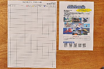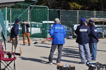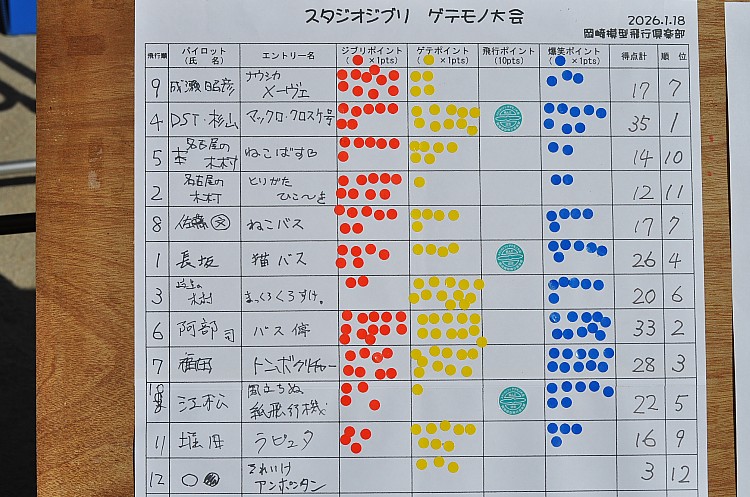 | 2 開会式 エントリー機を眺めて満足。 もう飛行会・大会はどうでもいいと思いつつも開会式。 得点表にそれぞれ記入して受付終了。 ジブリポイント、ゲテポイント、飛行ポイント、爆笑ポイントで競います。 |