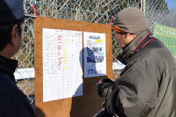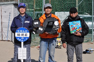 | 何気に疲れ切ってしまいました(笑)が、無事、閉会式。 右の写真は左から 第2位 阿部さん(バス停)、優勝 杉山さん(まっくろくろすけ)、第3位 福田さん(ヘビケラ)。 |