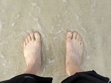 他の観光客の邪魔をしないよう、離れて海に入り、出てから砂浜に座っていると、向かって右の、10メートル程度は離れていたはずの若い女性2人連れが、海に向かって写真を撮りながら、徐々に私のほうへ近づいてきています。