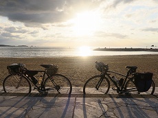 そこは扇ヶ浜でした。白良浜ほどの特別感はないものの、穏やかで落ち着きのある良い砂浜です。この日、自転車でほとんど走っておらず、旅に来たのに中途半端な気分だった妻が、砂浜で波の音を聞き、すっかり気持ちがほぐれたそうです。