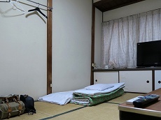 宿泊する旅館は昭和中期?の歴史あるたたずまい。トイレも和式。私たちは価格重視。風呂に入れて布団で横になることができればそれでいいのです。