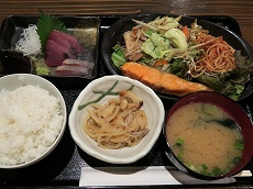 駅前の繁華街とその周辺は居酒屋や焼肉店など客単価が高め。食事だけしたい私たちは駅から少し離れた食堂へ。ここで選んだ夜定食、いくつかの種類の中から2つの品を選ぶスタイルで私は焼き鮭と野菜炒めをチョイス。嬉しいことにボリュームたっぷり、何よりも野菜炒めが旨くてアタリでした!