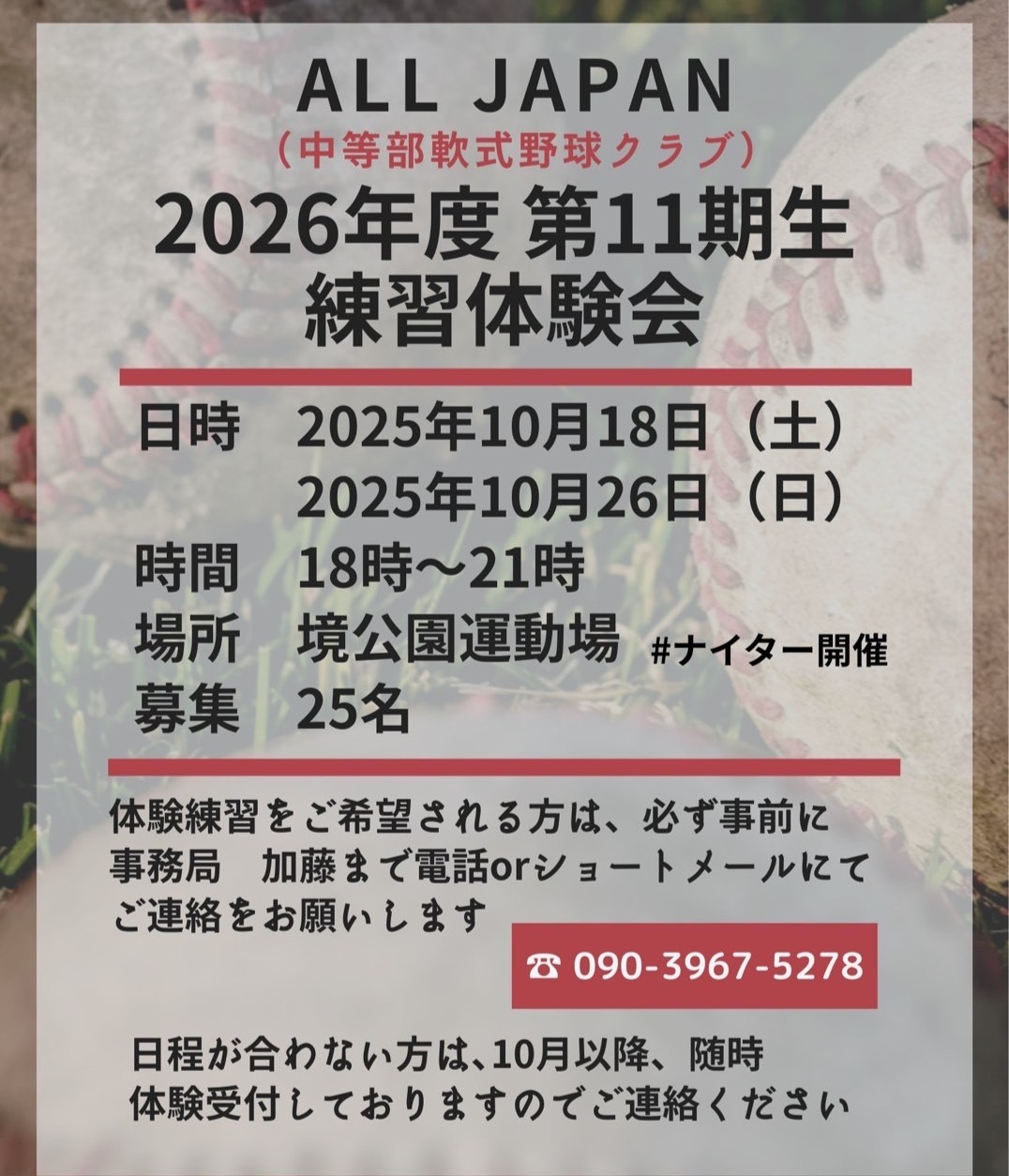 土 | 境公園両面 | 18:00-21:00 | 2年生/通常練習 3年生/体験手伝 |