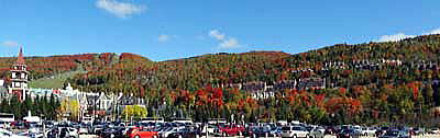 | メープル街道の紅葉のハイライト、ローレンシャン高源に着いた。 湖を囲んで麓に広がる瀟洒な建物に囲まれた高級リゾート地。 早速ケーブルで、標高1.000メートルに登る。 |
