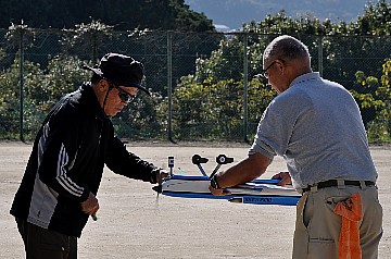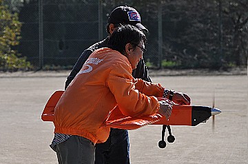 | 2 チカットファイヤー 少し久振りの成田さん。 レーサー風のスピットファイヤーですが、全面チェック柄のフィルム。 目がチカチカ、カメラのオートフォーカスのピントが合いません・・・ってのは冗談です(笑)。 KMCoのスピットファイヤーベースでFS52 4サイクル搭載です。 |