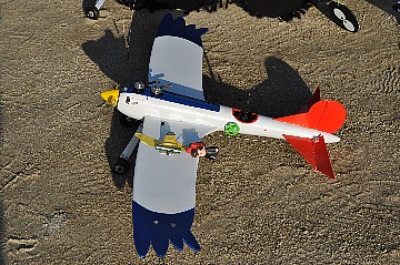 | 3 競技開始 厳正抽選で1番手の長坂さんがねこばすを飛ばします。 倒立でエンジン始動? 主翼もないのに飛んでます! 飛んだ認定、第一号! |
