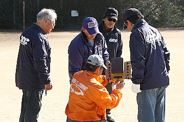 | 何気に疲れ切ってしまいました(笑)が、無事、閉会式。 右の写真は左から 第2位 阿部さん(バス停)、優勝 杉山さん(まっくろくろすけ)、第3位 福田さん(ヘビケラ)。 |