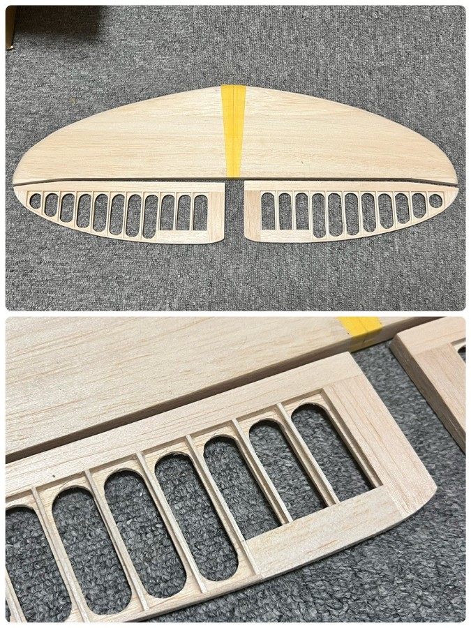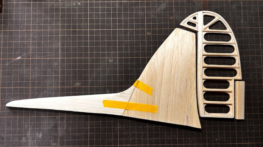 機首の短い飛行機で尾部は特に軽量化が必要なため垂直尾翼は1.5mmプランク、ラダー部分は実機どおり羽布張りのところは本物と同じ骨組み、絹張りの予定です。(2025.6.13) |