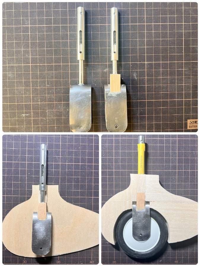 模型とはいえダンパー機能が必要。あれこれ構造を考えましたが、タイヤが大きく脚自体が短いので実機とほぼ同じ構造になりました。