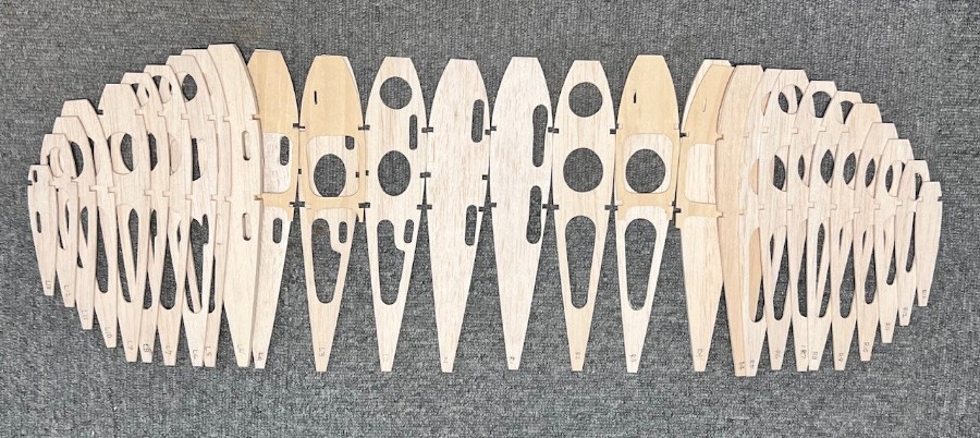 楕円翼なのでテーパー翼のように中央リブから翼端リブを重ねて削ることはできず、いつものようにWingPro(パソコン)でリブ形を印字し、バルサに貼って1枚ずつ切り出し。