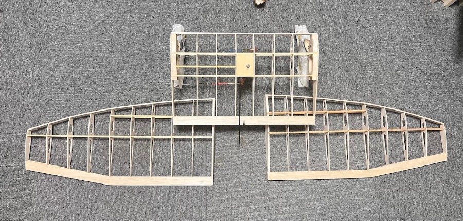主翼のリブ組み完成。これから左右の上反角付きの翼の合体。