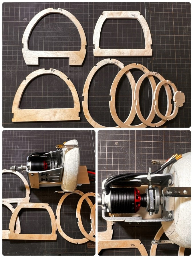 これからプッシュロッドを繋ぎ、コックピットの床板などを組み込んでから胴体プランクをする予定です。胴体プランクは当初2mmバルサの予定でしたが、強度的に3mm甲板張りとして2mm近くまで削り込んで整形します。(2025.5.6) |