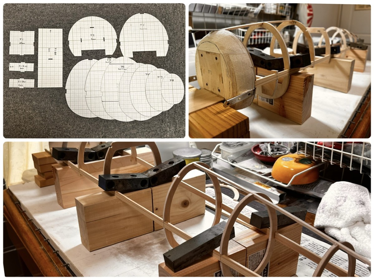 一旦、胴体骨組が完成したものの、胴体後半の曲線に納得できず、悩んだ挙句、後半部分を作り直しました。