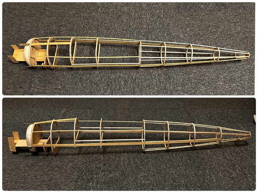 次はいよいよ中央の上反角のない部分のリブ組み。 過剰強度とならないよう軽量化に気を付けないと。 (2024.2.22) |