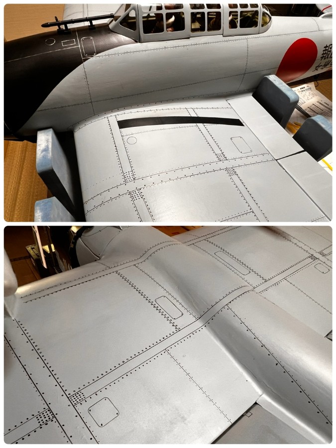 そもそも九九艦爆のフラップが金属皮膜なのか、羽布張りなのか松葉稔さんの精密図面でも判明できず。プラモデルでも平面に仕上げているものと、羽布張り仕上げしてあるものと両方ある。