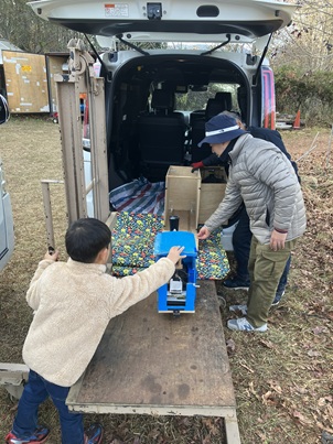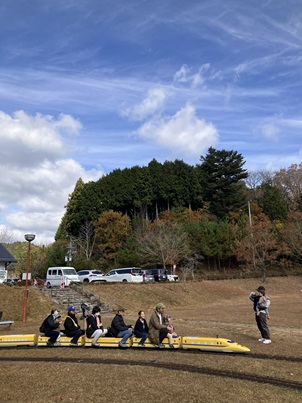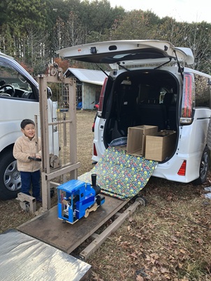 段ボール機関車も、撤収はみんなと同じようにリフトを使います。 楽しそうですね。