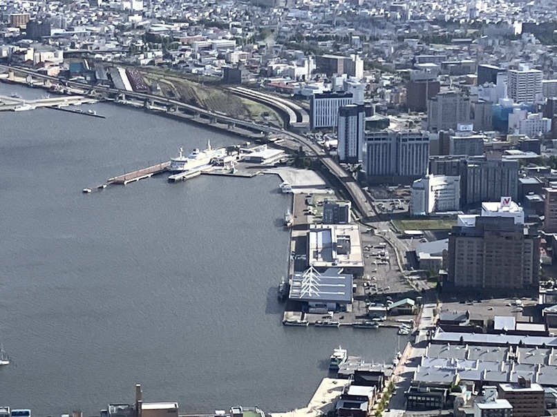 カーブした函館駅の線路の手前には、かつての青函連絡船の摩周丸が停泊しています。