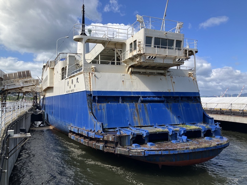 摩周丸の函館駅側には船内から駅の線路につながる線路が3本のぞいていて、かつて鉄道連絡があったことがわかります。