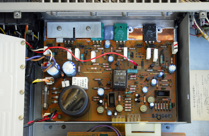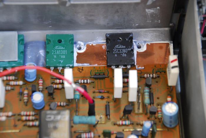 次の写真はパワートランジスタの押さえ金(片チャンネル)を外した状態。元々使われていた