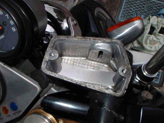マスターシリンダーのふたを開け、ダイヤフラムも取る。 UPPERラインまで新しいフルードを注ぐ。 |