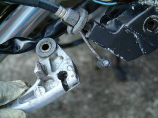 新品レバーにワイヤーのタイコ部をはめ込んでクラッチホルダーにセットする。 ワイヤーを引っ張るようにしてワイヤーホルダーの溝にワイヤーをはめながらレバーを収める。 で、ヒンジピンを差し込んだら終了。 ピンの裏側のナットを締めるのをお忘れなく。 |
