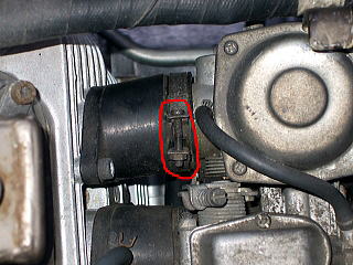 続いてキャブレターとエアクリーナケースをつなぐ部分(エアクリーナーケースキャップにつながってます)にあるバンドを緩めます。 バンドはネジ1本で締め付けてられているだけなので、ネジがはずれてしまわないくらいまで緩めます。 バンドはケースキャップとともにはずれることになります。 2連キャブなのでもうひとつのほうもはずしてください。 |